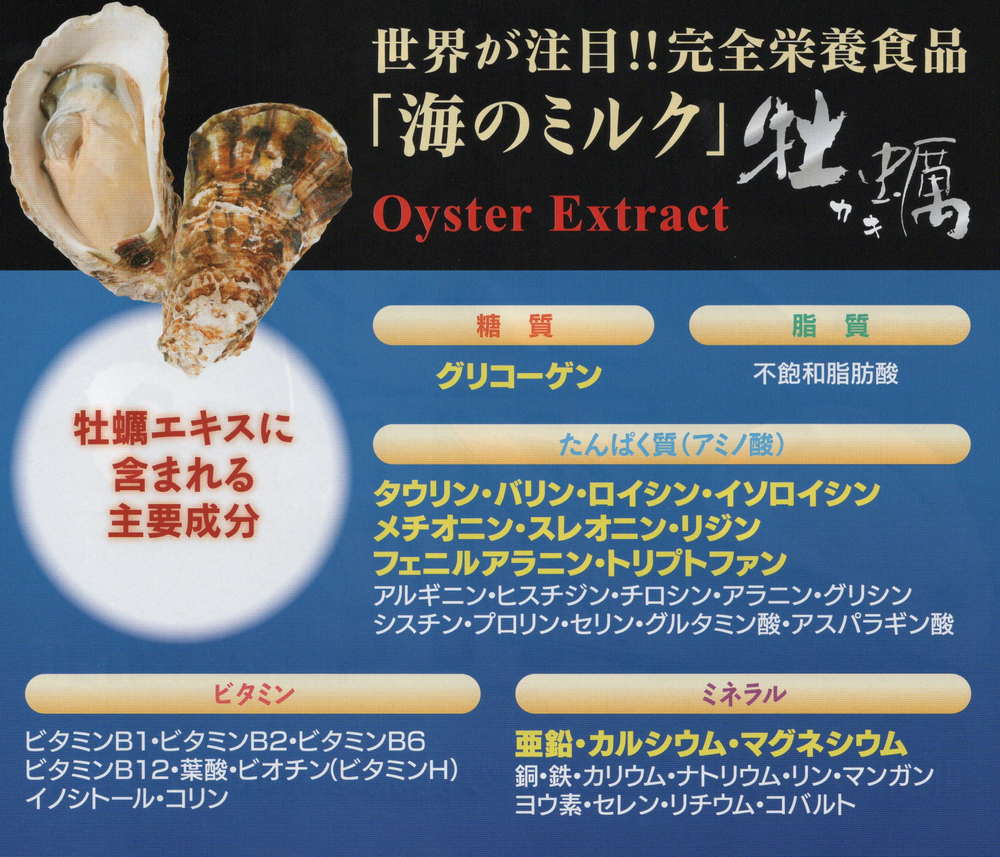 牡蠣は「海のミルク」と呼ばれ、糖質のグリコーゲン、ミネラルの亜鉛を含み、その栄養価が高いことで知られている健康応援食品です。牡蠣エキス 亜鉛 野葡萄 垂盆草エキスが健康をサポートします。